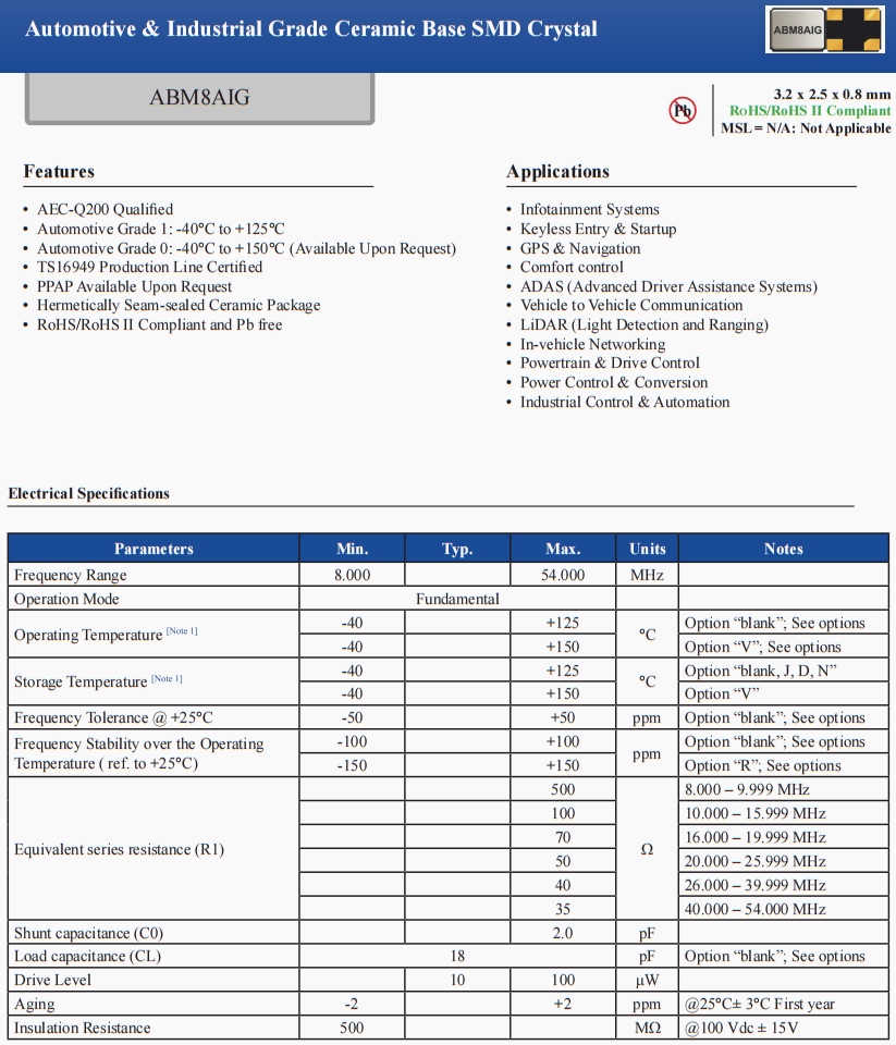 ABM8AIG-12.288MHZ-12-2-T3進口晶振,Abracon進口3225晶振,ABM8AIG汽車動力總成晶振,美國Abracon晶振公司,艾博康晶振,ABM8AIG晶振,ABM8AIG-12.288MHZ-12-2-T3晶振,進口晶振,無源晶振,美國晶振,高品質晶振,低損耗晶振,高精度晶振,3225晶振,四腳晶振,石英晶體,貼片晶振。AEC-Q200合格,汽車等級1:-40°C至+125°C,汽車等級0:-40°C至+150°C(可根據(jù)要求提供),TS16949生產(chǎn)線認證,PPAP可根據(jù)要求提供,密封密封陶瓷封裝,符合RoHS/RoHS II標準且不含鉛,信息娛樂系統(tǒng),無鑰匙進入和啟動,GPS和導航,舒適控制,ADAS(高級駕駛輔助系統(tǒng)),車對車通信,激光雷達(光探測和測距),車載網(wǎng)絡,動力總成和驅動控制,電源控制和轉換,工業(yè)控制和自動化