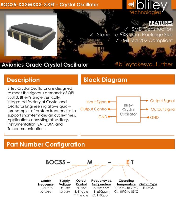 百利晶振,BOCS5晶振,BOCS5-26.000MDE-ACET晶振,5032mm體積的石英晶體振蕩器,有源晶振,該產(chǎn)品可驅(qū)動(dòng)2.5V的溫補(bǔ)晶振,壓控晶振,VC-TCXO晶體振蕩器產(chǎn)品,電源電壓的低電耗型,編帶包裝方式,可對(duì)應(yīng)自動(dòng)高速貼片機(jī)自動(dòng)焊接,及IR回流焊接(無(wú)鉛對(duì)應(yīng)),為無(wú)鉛產(chǎn)品,超小型,質(zhì)地輕.產(chǎn)品被廣泛應(yīng)用到集成電路,程控交換系統(tǒng),無(wú)線發(fā)射基站.Bliley Technologies Inc. 最初于 1930 年作為 Bliley Piezo-Electric Company 成立。最初,我們?yōu)闃I(yè)余無(wú)線電市場(chǎng)制造石英晶體。在 1930 年代中期,我們的客戶和產(chǎn)品很快擴(kuò)大到與新興的軍事和商業(yè)通信領(lǐng)域的利益相匹配,我們的名稱更名為 Bliley Electric Company。1939 年,我們是最大的水晶公司,擁有 11 名員工。