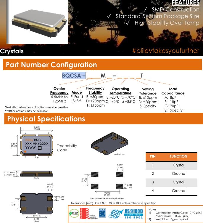 Bliley Crystal總部位于美麗的伊利賓夕法尼亞州是美國僅此一家在同一工廠內生產使用到石英晶體和石英晶體振蕩器的公司之一. Bliley晶振擁有的ISO 9001:2008認證制造工廠.并不斷研發TCXO振蕩器,時鐘振蕩器等一系列產品.Bliley晶振,BQCSA晶振,BQCSA-12.000M-3DCDFT晶振.