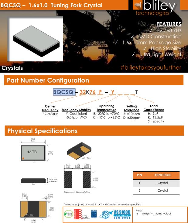 Bliley晶振,BQCSQ晶振,BQCSQ-32K76F-YBBKT晶振,貼片表晶32.768K系列具有超小型,薄型,質(zhì)地輕的表面貼片音叉型石英晶體振蕩器,晶振產(chǎn)品本身具備優(yōu)良的耐熱性,耐環(huán)境特性,在辦公自動(dòng)化,家電領(lǐng)域,移動(dòng)通信領(lǐng)域可發(fā)揮優(yōu)良的電氣特性,符合無(wú)鉛標(biāo)準(zhǔn),滿足無(wú)鉛焊接的回流溫度曲線要求,金屬外殼的石英晶振使得產(chǎn)品在封裝時(shí)能發(fā)揮比陶瓷晶振外殼更好的耐沖擊性能.Bliley Technologies Inc. 最初于 1930 年作為 Bliley Piezo-Electric Company 成立。最初,我們?yōu)闃I(yè)余無(wú)線電市場(chǎng)制造石英晶體。在 1930 年代中期,我們的客戶和產(chǎn)品很快擴(kuò)大到與新興的軍事和商業(yè)通信領(lǐng)域的利益相匹配,我們的名稱更名為 Bliley Electric Company。1939 年,我們是最大的水晶公司,擁有 11 名員工。