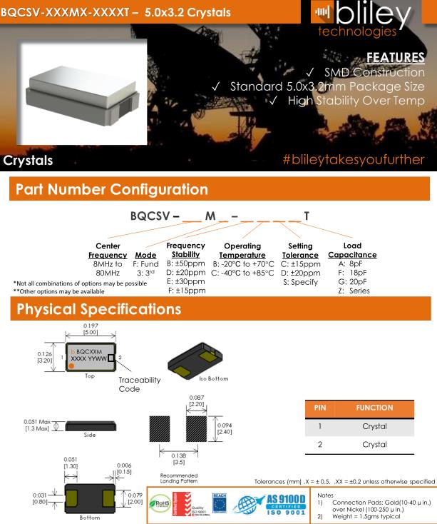 Bliley晶振,BQCSV晶振,BQCSV-20.000M-FBDGT晶振,智能手機(jī)晶振,產(chǎn)品具有高精度超小型的表面貼片型石英晶體振蕩器,最適用于移動(dòng)通信終端的基準(zhǔn)時(shí)鐘等移動(dòng)通信領(lǐng)域.比如智能手機(jī),無線通信,衛(wèi)星導(dǎo)航,平臺(tái)基站等較高端的數(shù)碼產(chǎn)品,晶振本身小型,薄型具備各類移動(dòng)通信的基準(zhǔn)時(shí)鐘源用頻率,貼片晶振具有優(yōu)良的電氣特性,耐環(huán)境性能適用于移動(dòng)通信領(lǐng)域,滿足無鉛焊接的高溫回流溫度曲線要求.Bliley晶振公司發(fā)展歷史: