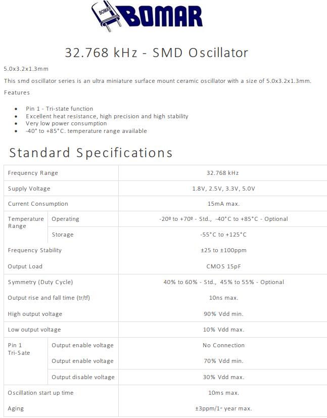 Bomar晶振,B1350-ADDS3T-32.768kHz晶振,高精度晶振,小型SMD有源晶振,從最初超大體積到現在的7050mm,6035mm,5032mm,3225mm,2520mm體積,有著翻天覆地的改變,體積的變小也使產品帶來了更高的穩定性能,接縫密封石英晶體振蕩器,精度高,覆蓋頻率范圍寬的特點,SMD高速自動安裝和高溫回流焊設計,Optionable待機輸出三態輸出功能,電源電壓范圍:1.8V~5V,高穩定性,低抖動,低功耗,主要應用領域:無線通訊,高端智能手機,平板筆記本WLAN,藍牙,數碼相機,DSL和其他IT產品的晶振應用,三態功能,PC和LCDM等高端數碼領域,符合RoHS/無鉛.Bomar 成立于 1963 年,是一家為商業和雙向無線電行業生產石英晶體的制造商。該業務的性質要求在寬頻率范圍內具有嚴格的容差和高穩定性晶體,以滿足嚴格的 FCC 規范。快速生產的需求對我們不斷增長的客戶群很重要。我們的許多客戶都是當地、州和聯邦警察和監視機構。Bomar 很快不僅成為該市場的領先供應商,而且因其產品質量、快速周轉時間和無與倫比的客戶服務而獲得一致認可。