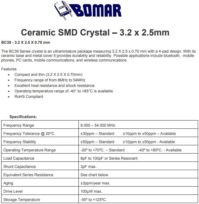 Bomar晶振,BC39晶振,BC39EFD120-10.000000晶振,小型貼片石英晶振,外觀尺寸具有薄型表面貼片型石英晶體振蕩器,特別適用于有小型化要求的市場領(lǐng)域,比如智能手機,無線藍牙,平板電腦等電子數(shù)碼產(chǎn)品.晶振本身超小型,薄型,重量輕,晶體具有優(yōu)良的耐環(huán)境特性,如耐熱性,耐沖擊性,在辦公自動化,家電相關(guān)電器領(lǐng)域及Bluetooth,WirelessLAN等短距離無線通信領(lǐng)域可發(fā)揮優(yōu)良的電氣特性,滿足無鉛焊接的回流溫度曲線要求.Bomar成立于 1963 年,是一家為商業(yè)和雙向無線電行業(yè)生產(chǎn)石英晶體的制造商。該業(yè)務(wù)的性質(zhì)要求在寬頻率范圍內(nèi)具有嚴格的容差和高穩(wěn)定性晶體,以滿足嚴格的 FCC 規(guī)范。快速生產(chǎn)的需求對我們不斷增長的客戶群很重要。我們的許多客戶都是當?shù)亍⒅莺吐?lián)邦警察和監(jiān)視機構(gòu)。Bomar 很快不僅成為該市場的領(lǐng)先供應(yīng)商,而且因其產(chǎn)品質(zhì)量、快速周轉(zhuǎn)時間和無與倫比的客戶服務(wù)而獲得一致認可。