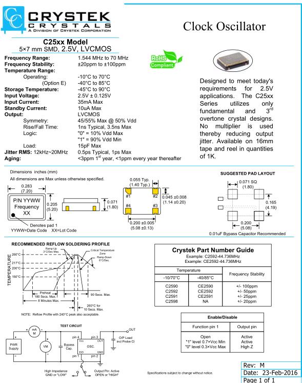 Crystek晶振,C25XX晶振,C1892-44.736MHZ晶振,小型SMD有源晶振,從最初超大體積到現在的7050mm,6035mm,5032mm,3225mm,2520mm體積,有著翻天覆地的改變,體積的變小也使產品帶來了更高的穩定性能,接縫密封石英晶體振蕩器,精度高,覆蓋頻率范圍寬的特點,SMD高速自動安裝和高溫回流焊設計,Optionable待機輸出三態輸出功能,電源電壓范圍:1.8V?5V,高穩定性,低抖動,低功耗,主要應用領域:無線通訊,高端智能手機,平板筆記本WLAN,藍牙,數碼相機,DSL和其他IT產品的晶振應用,三態功能,PC和LCDM等高端數碼領域,符合RoHS/無鉛.