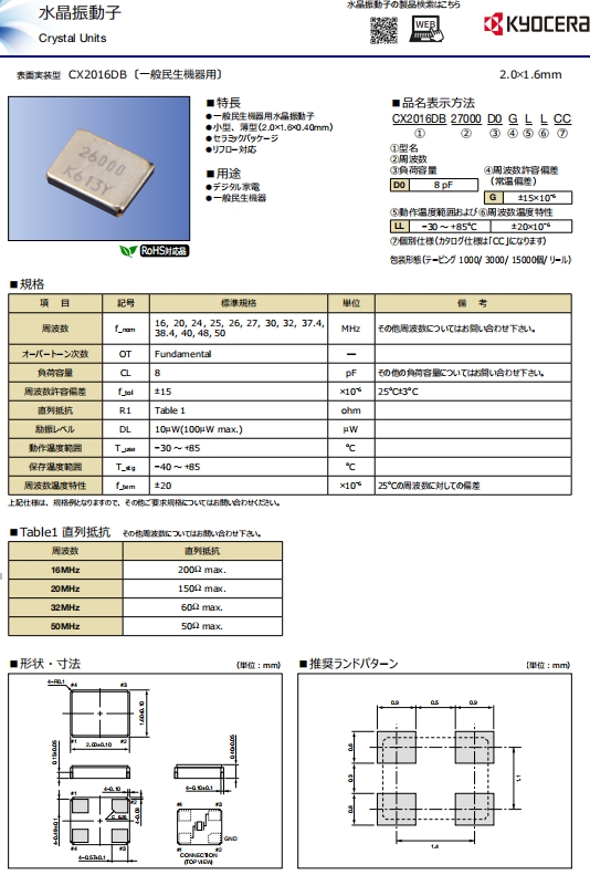 | CX2016DB32000D0GPSC1 | Kyocera水晶振動(dòng)子 | CX2016DB, Kyocera | MHz Crystal | 32MHz | -40°C ~ 85°C |