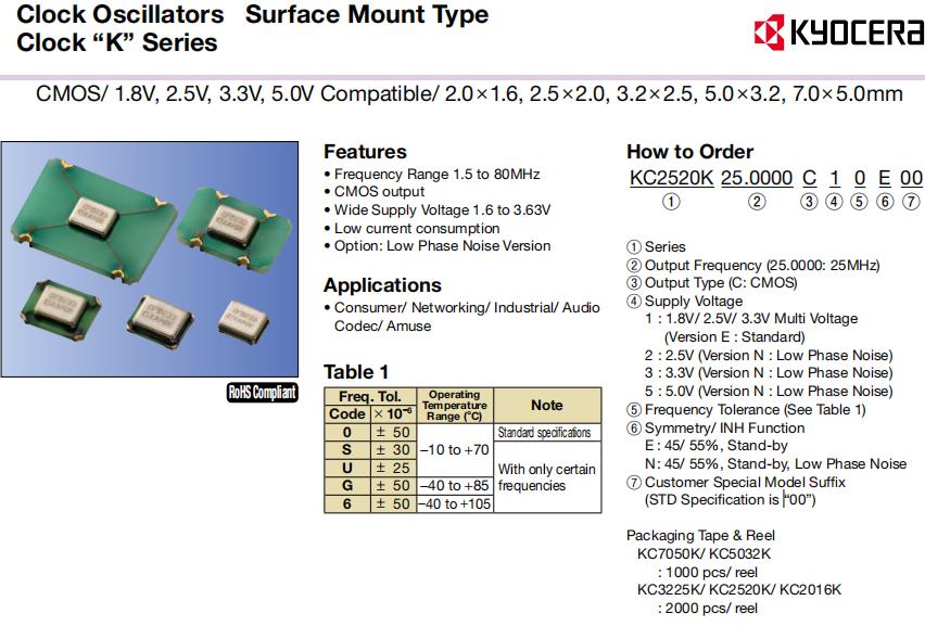 | KC2520K33.3333C1GE00 | Kyocera有源振蕩器 | KC2520K, Kyocera | 33.3333MHz | 1.6 V ~ 3.63 V | -40°C ~ 85°C |