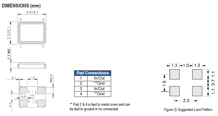 | Size/Dimension尺寸 | 3225mm | 安裝方式 Installation: | Surfacemount |