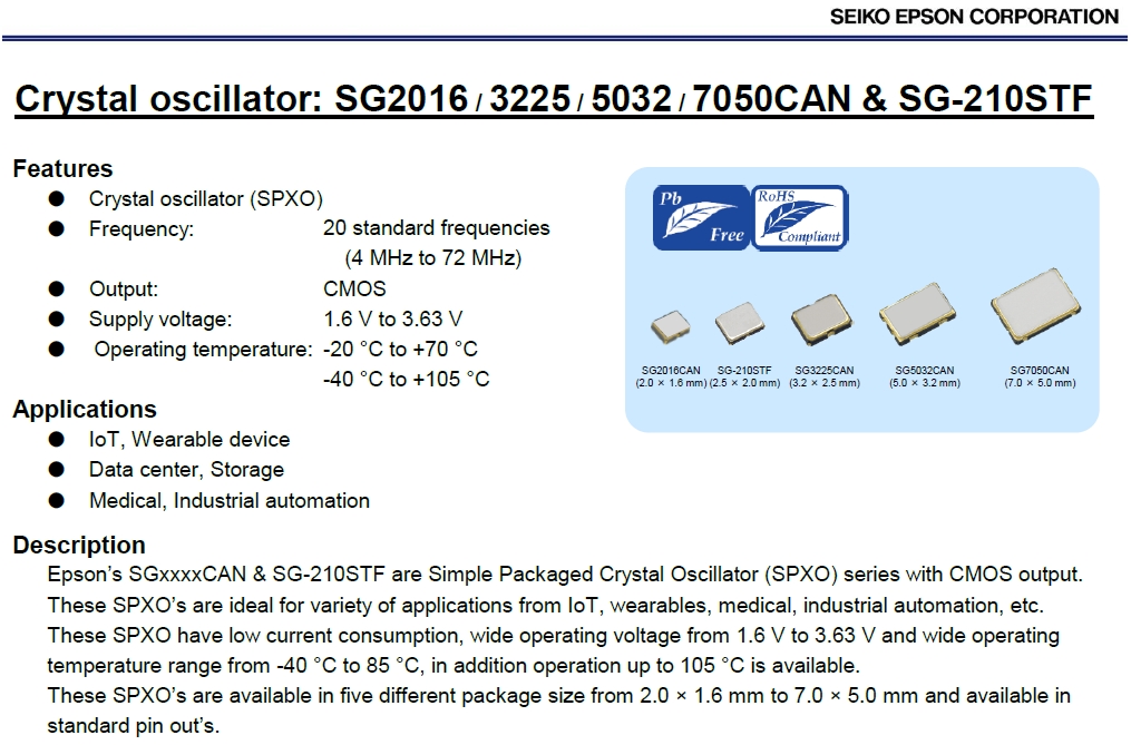 | X1G0055910049 | 愛普生有源振蕩器 | SG-8018CE | 4.000000 MHz | 3.20 x 2.50 x 1.20 mm | CMOS | 1.620 to 3.630 V | -40 to 105 °C |