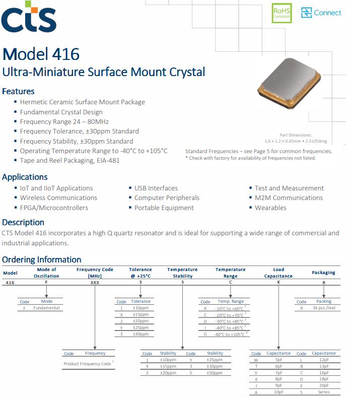 | 416F4801XADR | CTS晶振 | 416 | MHz Crystal | 48MHz |