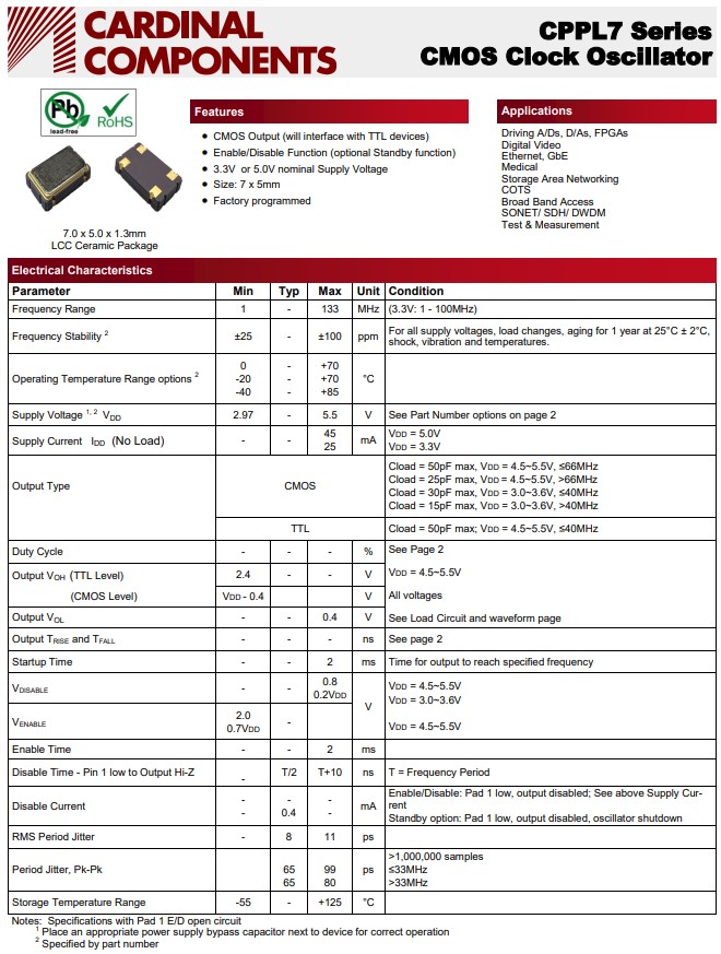 | CPPLC7L-BP-100.0TS | Cardinal晶振 | FIPO™ CPPL | 100MHz | OSC XO 100.000MHZ CMOS SMD |