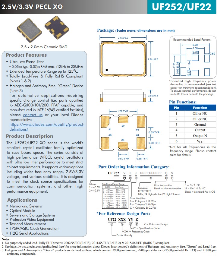 UF252系列具有超低抖動性能的高性能LVPECL差分晶振,UF2521AB125.000000QX,晶體振蕩器