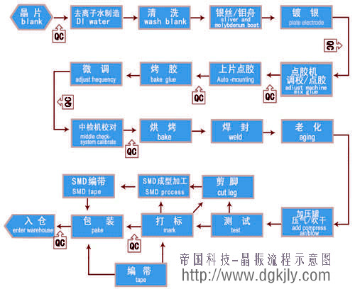 選取晶棒-AT/BT切割-晶片研磨-倒角-清洗腐蝕晶片雜質-鍍電-點膠-微調-真空封焊-老化-激光打標-測試-包裝-出售.