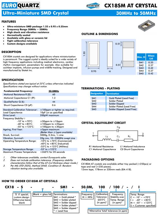 Euroquartz晶振,CX18SMAT晶振,CX18-S-SM1-50.0M,100/100/I晶振
