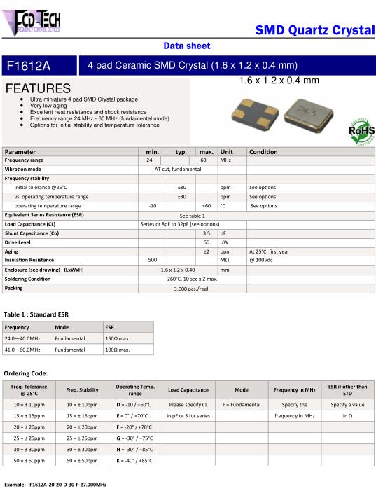 FCD-Tech晶振,F1612A晶振,F1612A-2020D30F-26.000MHz晶振,貼片晶振本身體積小,超薄型石英晶體振蕩器,特別適用于有目前高速發展的高端電子數碼產品,因為晶振本身小型化需求的市場領域,小型,薄型是對應陶瓷振蕩器(偏差大)和普通的石英晶體振蕩器(偏差小)的中間領域的一種性價比較出色的產品.產品廣泛用于筆記本電腦,無線電話,衛星導航SSD,USB,Blu-ray等用途,符合無鉛焊接的高溫回流焊曲線特性.FCD-Tech晶振電子元器件廠家重要經營的產品范圍有:石英晶體,晶體振蕩器,水晶過濾器,射頻和微波產品,壓電晶體傳感器這些大類產品,今天主要介紹壓電晶體傳感器這一系列元器件產品,使用石英晶體為監控測試設備進行高精度的測量,溫度,質量,同時為其提供高性能的準確導航定位