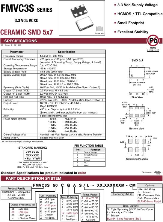 FMI晶振,FMVC3S晶振,FMVC3S50CGAS/L-24.000M-CM晶振,壓控晶振(VCXO),壓控石英晶體振蕩器基本解決方案,PECL輸出,輸出頻率60MHz到200MHz之間,出色的低相位噪聲和抖動,三態功能,應用:SDH/SONET,以太網,基站,筆記本晶振應用,符合RoHS/無鉛.環境政策