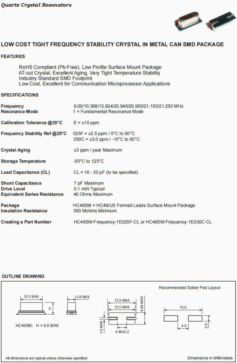 | 包裝 | HC49SM = HC49/US Formed Leads Surface Mount Package |