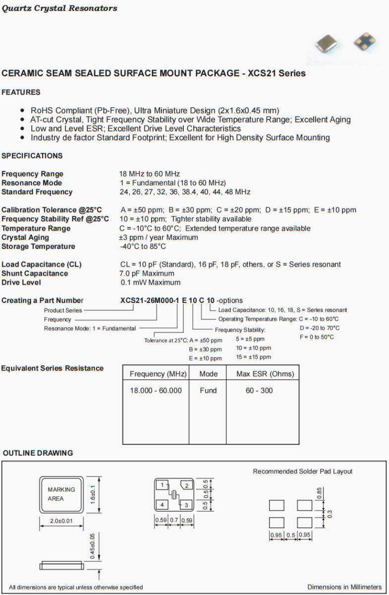 Fortiming高品質(zhì)晶振,XCS21-19M020-1E10C10環(huán)保晶振,工業(yè)機器人晶振,美國Fortiming晶振公司,富通晶振,SMD晶振,超小型晶振,2016晶振,北斗導(dǎo)航模塊晶振,醫(yī)療設(shè)備晶振,低損耗晶振,四腳晶振,低成本晶振,環(huán)保無鉛晶振,高穩(wěn)定性晶振,石英晶振,貼片晶振,6G網(wǎng)絡(luò)終端晶振,無源晶振,陶瓷SEAM密封表面貼裝封裝- XCS21系列,特點,符合RoHS標(biāo)準(zhǔn)(無鉛),超小型設(shè)計(2x1.6x0.45 mm), at切割晶體,寬溫度范圍內(nèi)緊密的頻率穩(wěn)定性;優(yōu)異的老化性能,低水平的ESR;卓越的驅(qū)動級特性,行業(yè)標(biāo)準(zhǔn)的足跡;非常適合高密度表面安裝