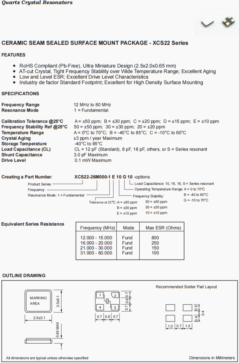 高品質(zhì)富通晶振,智能輔助駕駛晶振,XCS22-12M288-1E20G10晶振,美國Fortiming晶振公司,歐美晶振,富通晶振,石英晶振,貼片晶振,小體積晶振,高品質(zhì)晶振,低損耗晶振,耐高溫晶振,進(jìn)口晶振,無源晶振,四腳晶振,汽車晶振,多功能方向盤晶振,無人機晶振,6G通訊設(shè)備晶振,陶瓷SEAM密封表面安裝包- XCS22系列具有RoHS兼容(無鉛),超微型設(shè)計(2.5x2.0x0.65 mm)切割晶體,在寬溫度范圍內(nèi)的頻率穩(wěn)定性;優(yōu)良的低老化水平和水平ESR;優(yōu)秀的驅(qū)動水平特性行業(yè)因素標(biāo)準(zhǔn)足跡;適用于高密度表面安裝