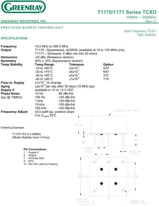 T1170 - Squarewave, ACMOS (available at 10 to 125 MHz only) T1171 – Sinewave, 0 dBm min into 50 ohms |