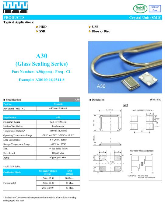 ITTI晶振,A30晶振,A30100-16.9344-8晶振,超小型表面貼片型SMD晶振,最適合使用在汽車電子領(lǐng)域中,也是特別要求高可靠性的引擎控制用CPU的時鐘部分.低頻晶振可從7.98MHz起對應(yīng),小型,超薄型具備強防焊裂性,石英晶體在極端嚴(yán)酷的環(huán)境條件下也能發(fā)揮穩(wěn)定的起振特性,產(chǎn)品本身具有耐熱,耐振,耐撞擊等優(yōu)良的耐環(huán)境特性,滿足無鉛焊接以及高溫回流溫度曲線要求,符合AEC-Q200標(biāo)準(zhǔn).TTI抱著簡單而創(chuàng)新的宗旨,為各客戶提供優(yōu)質(zhì),經(jīng)濟的石英電子,更希望成為各位客戶之長遠合作伙伴; 擁有全面,先進之石英晶體,包括, 晶體濾波器(Crystal Filter)、陶瓷諧振器(Ceramic Resonator) 與及其他最先進之晶體振蕩器(Crystal Oscillator)…。等產(chǎn)品。我們擁有可媲美世界一級水平之能力及資源。