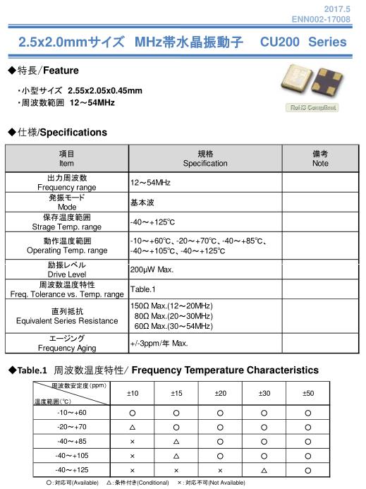 NAKA晶振,CU200晶振,水晶振動子,小體積貼片2520mm晶振,外觀小型,表面貼片型晶體振蕩器,因本身體積小等優勢,適用于移動通信終端的基準時鐘等移動通信領域.小型,薄型,輕型,具備優良的耐環境特性及高耐熱性強.滿足無鉛焊接的回流溫度曲線要求.納卡晶振公司是使用模擬電路技術,擅長定制規格的水晶設備制造廠。有強烈要求“低相位噪聲、高頻、高信賴性”的通信設備、廣播設備、測量儀器、交通基礎設施、醫療器械、防衛設備。另外,現在已經成為問題了,對生產中止,實現長期性的產品供應,以滿足顧客未來的企業為目標。