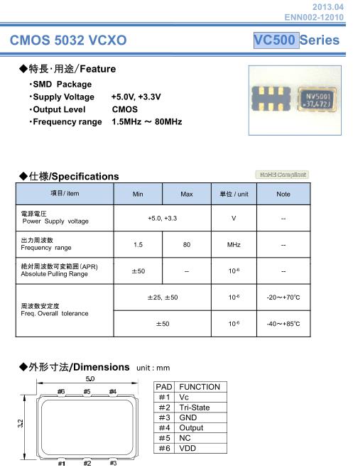 NAKA晶振,VC500晶振,VCXO晶振,5032mm體積的石英晶體振蕩器,有源晶振,該產(chǎn)品可驅(qū)動(dòng)2.5V的溫補(bǔ)晶振,壓控晶振,VC-TCXO晶體振蕩器產(chǎn)品,電源電壓的低電耗型,編帶包裝方式,可對(duì)應(yīng)自動(dòng)高速貼片機(jī)自動(dòng)焊接,及IR回流焊接(無鉛對(duì)應(yīng)),為無鉛產(chǎn)品,超小型,質(zhì)地輕.產(chǎn)品被廣泛應(yīng)用到集成電路,程控交換系統(tǒng),無線發(fā)射基站.納卡晶振公司是使用模擬電路技術(shù),擅長(zhǎng)定制規(guī)格的水晶設(shè)備制造廠。有強(qiáng)烈要求“低相位噪聲、高頻、高信賴性”的通信設(shè)備、廣播設(shè)備、測(cè)量?jī)x器、交通基礎(chǔ)設(shè)施、醫(yī)療器械、防衛(wèi)設(shè)備。另外,現(xiàn)在已經(jīng)成為問題了,對(duì)生產(chǎn)中止,實(shí)現(xiàn)長(zhǎng)期性的產(chǎn)品供應(yīng),以滿足顧客未來的企業(yè)為目標(biāo)。