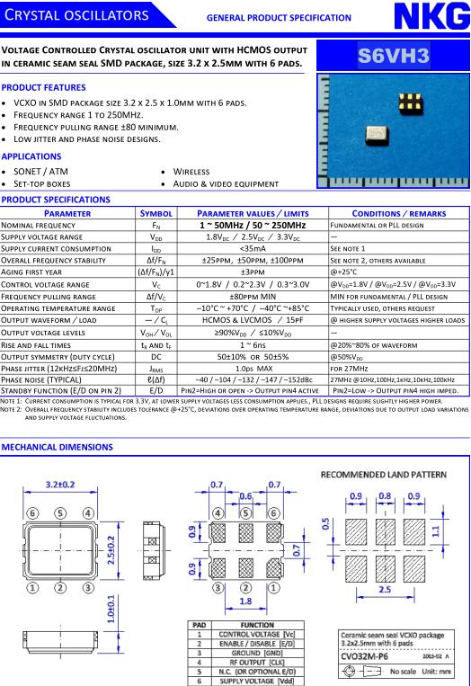 NJR晶振,S6VH3晶振,S6VH333B-20.000MT50A-EXT晶振,小型SMD有源晶振,從最初超大體積到現在的7050mm,6035mm,5032mm,3225mm,2520mm體積,有著翻天覆地的改變,體積的變小也使產品帶來了更高的穩定性能,接縫密封石英晶體振蕩器,精度高,覆蓋頻率范圍寬的特點,SMD高速自動安裝和高溫回流焊設計,Optionable待機輸出三態輸出功能,電源電壓范圍:1.8V~5V,高穩定性,低抖動,低功耗,主要應用領域:無線通訊,高端智能手機,平板筆記本WLAN,藍牙,數碼相機,DSL和其他IT產品的晶振應用,三態功能,PC和LCDM等高端數碼領域,符合RoHS/無鉛..