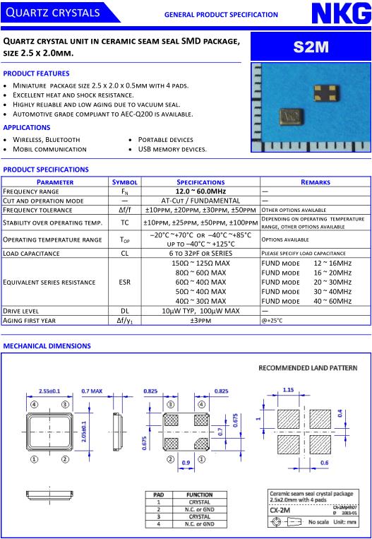 NKG晶振,S2M晶振,S2M-26.0000F-18E2-EXT晶振,小型貼片石英晶振,外觀尺寸具有薄型表面貼片型石英晶體振蕩器,特別適用于有小型化要求的市場領域,比如智能手機,無線藍牙,平板電腦等電子數碼產品.晶振本身超小型,薄型,重量輕,晶體具有優良的耐環境特性,如耐熱性,耐沖擊性,在辦公自動化,家電相關電器領域及Bluetooth,WirelessLAN等短距離無線通信領域可發揮優良的電氣特性,滿足無鉛焊接的回流溫度曲線要求.