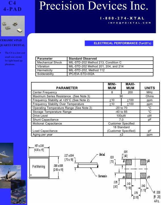PDI晶振,C4晶振,無源四腳晶振,貼片晶振本身體積小,超薄型石英晶體振蕩器,特別適用于有目前高速發(fā)展的高端電子數(shù)碼產(chǎn)品,因為晶振本身小型化需求的市場領(lǐng)域,小型,薄型是對應(yīng)陶瓷振蕩器(偏差大)和普通的石英晶體振蕩器(偏差小)的中間領(lǐng)域的一種性價比較出色的產(chǎn)品.產(chǎn)品廣泛用于筆記本電腦,無線電話,衛(wèi)星導(dǎo)航SSD,USB,Blu-ray等用途,符合無鉛焊接的高溫回流焊曲線特性.美國PDI 頻率控制元器件, 主要致力于石英晶振, 濾波器等系列產(chǎn)品規(guī)格的銷售。頻率控制產(chǎn)品:Crystals 石英晶體, Filter 晶體濾波器, XO 晶體振蕩器, VCXO壓控晶振, TCXO 溫補晶振, OCXO 恒溫晶振, TC-OCXO 溫補恒溫晶振, XO SMD封裝系列, XO 引線式封裝系列, TCXO SMD封裝系列, TCXO 引線式封裝系列, OCXO 恒溫晶振, OCXO SMD 封裝系列, OCXO 引線式封裝系列, TCVCXO 溫補壓控晶振.