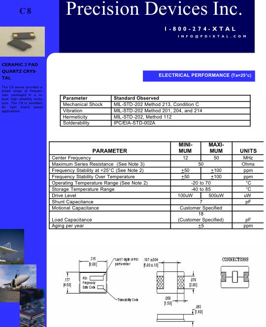 PDI晶振,C8晶振,PDI諧振器,貼片晶振本身體積小,超薄型石英晶體振蕩器,特別適用于有目前高速發(fā)展的高端電子數(shù)碼產(chǎn)品,因為晶振本身小型化需求的市場領(lǐng)域,小型,薄型是對應(yīng)陶瓷振蕩器(偏差大)和普通的石英晶體振蕩器(偏差小)的中間領(lǐng)域的一種性價比較出色的產(chǎn)品.產(chǎn)品廣泛用于筆記本電腦,無線電話,衛(wèi)星導(dǎo)航SSD,USB,Blu-ray等用途,符合無鉛焊接的高溫回流焊曲線特性.美國PDI 頻率控制元器件, 主要致力于石英晶振, 濾波器等系列產(chǎn)品規(guī)格的銷售。頻率控制產(chǎn)品:Crystals 石英晶體, Filter 晶體濾波器, XO 晶體振蕩器, VCXO壓控晶振, TCXO 溫補晶振, OCXO 恒溫晶振, TC-OCXO 溫補恒溫晶振, XO SMD封裝系列, XO 引線式封裝系列, TCXO SMD封裝系列, TCXO 引線式封裝系列, OCXO 恒溫晶振, OCXO SMD 封裝系列, OCXO 引線式封裝系列, TCVCXO 溫補壓控晶振.