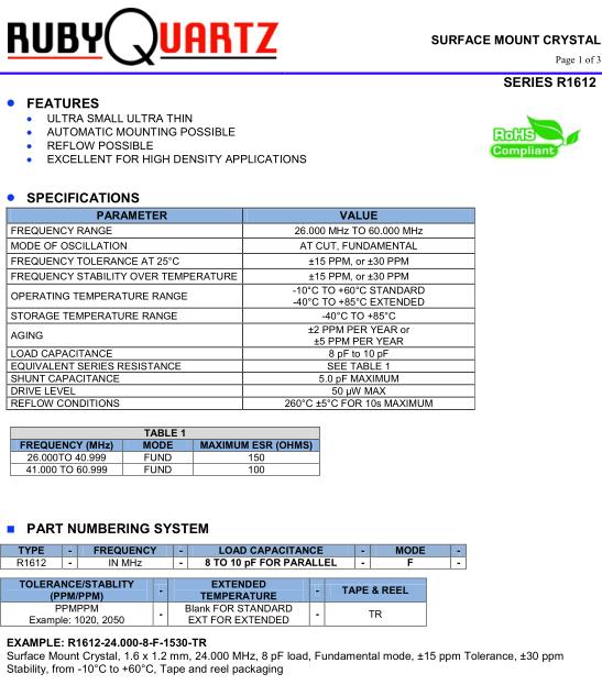 Rubyquartz晶振-Rubyquartz Crystal是領先的頻率元件供應商之一,主要提供市場盧柏貼片晶振,有源晶振,溫補晶振,石英晶體等產品.Rubyquartz晶振,R1612晶振,R1612-24.000-8-F-1530-TR晶振.