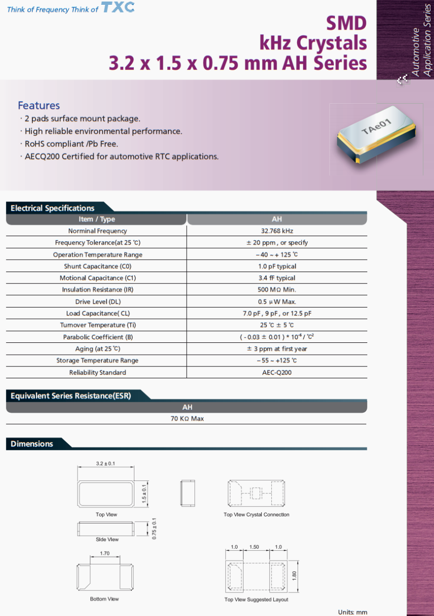 | AH-32.768KDWF-T | TXC晶振 | AH | 32.768kHz | - | ±20ppm | 12.5pF |