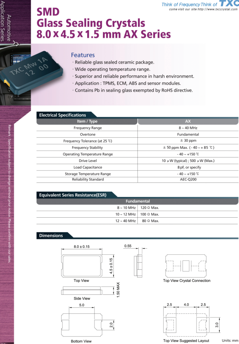 TXC汽車晶體,汽車中控晶振,AX-28.224MAGQ-T晶振,臺灣TXC晶振公司,汽車級晶振,無源晶振,車載USB晶振,高精度晶振,耐高溫晶振,高品質晶振,臺產晶振,8045晶振,貼片晶振,陶瓷面晶振,二腳晶振,AX系列貼片玻璃密封晶體,8.0 x4.5 x 1.5毫米。特點.可靠的玻璃密封陶瓷封裝。.工作溫度范圍寬。.惡劣環境下性能優越、可靠。·應用領域:TPMS,ECM,ABS和傳感器模塊。-不受RoHS指令限制的密封玻璃中含有鉛