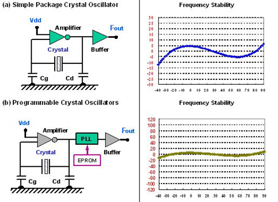 為了滿足應(yīng)用面需求而言, 石英晶體振蕩器內(nèi)部的振蕩線路有以基本波或三倍頻不同方式. 若要達到數(shù)佰兆赫的輸出頻率時, 振蕩線路后級可以采用鎖相回路方式或倍頻方式, 將較低頻率的石英振蕩頻率提升. 對于輸出端的輸出準位及輸出波形也有各類不同需求,如 CMOS, LVPECL, LVDS…..等. 這些規(guī)格都要仔細的定義.