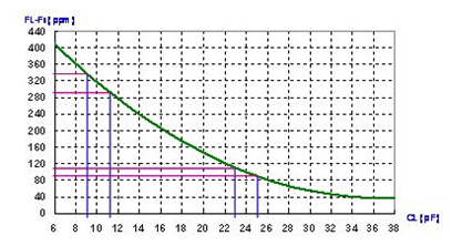 頻率的“牽引率”指的是負(fù)載電容CL1的頻率FL1到負(fù)載電容CL2的頻率FL2的頻率變化. 在(圖十一)中可以是FL1(CL=24pF)與FL2(CL=10pF)的頻率變化值. 在這個例子中的頻率牽引率是 220 ppm. 若我們將CL1與CL2的負(fù)載電容值趨近極小化(曲線作數(shù)學(xué)上的微分), 就會得到曲線的切線值. 這個切線值就是用某一個負(fù)載電容的敏感度( trim sensitivity ).