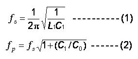 在評估共振時的等效線路時, 串聯諧振頻率及并聯諧振頻率, fs and fp , 是最重要的二個頻率參數. 對于串聯諧振頻率及并聯諧振頻率( fs and fp )二者的關系, 我們可以用下列公式來表達: