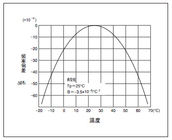 音叉型石英晶振的頻率溫度特性如左側的曲線圖所示,顯示了以+25°C為頂點的負向2次方程曲線. 溫度范圍越寬,則頻率的變化量也越大,因此,需要 考慮一下所使用環境的溫度范圍和必要的精度.[頻率溫度特性的近似公式]