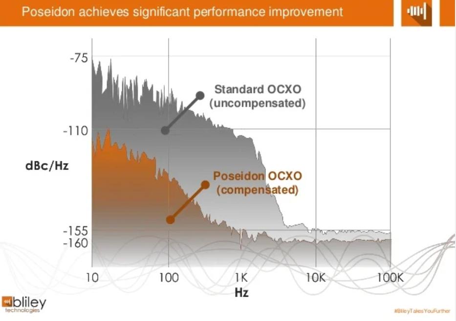 低相位噪聲振蕩器小于250 fs-RMS在高性能應(yīng)用中至關(guān)重要。這是因為高相位噪聲水平可能導(dǎo)致高誤碼率(BER)甚至系統(tǒng)通信完全丟失。因此,從低相位噪聲時鐘源開始總是更安全,尤其是在高端應(yīng)用中。如下圖所示,補償振蕩器可以顯著降低高振動環(huán)境中的相位噪聲。